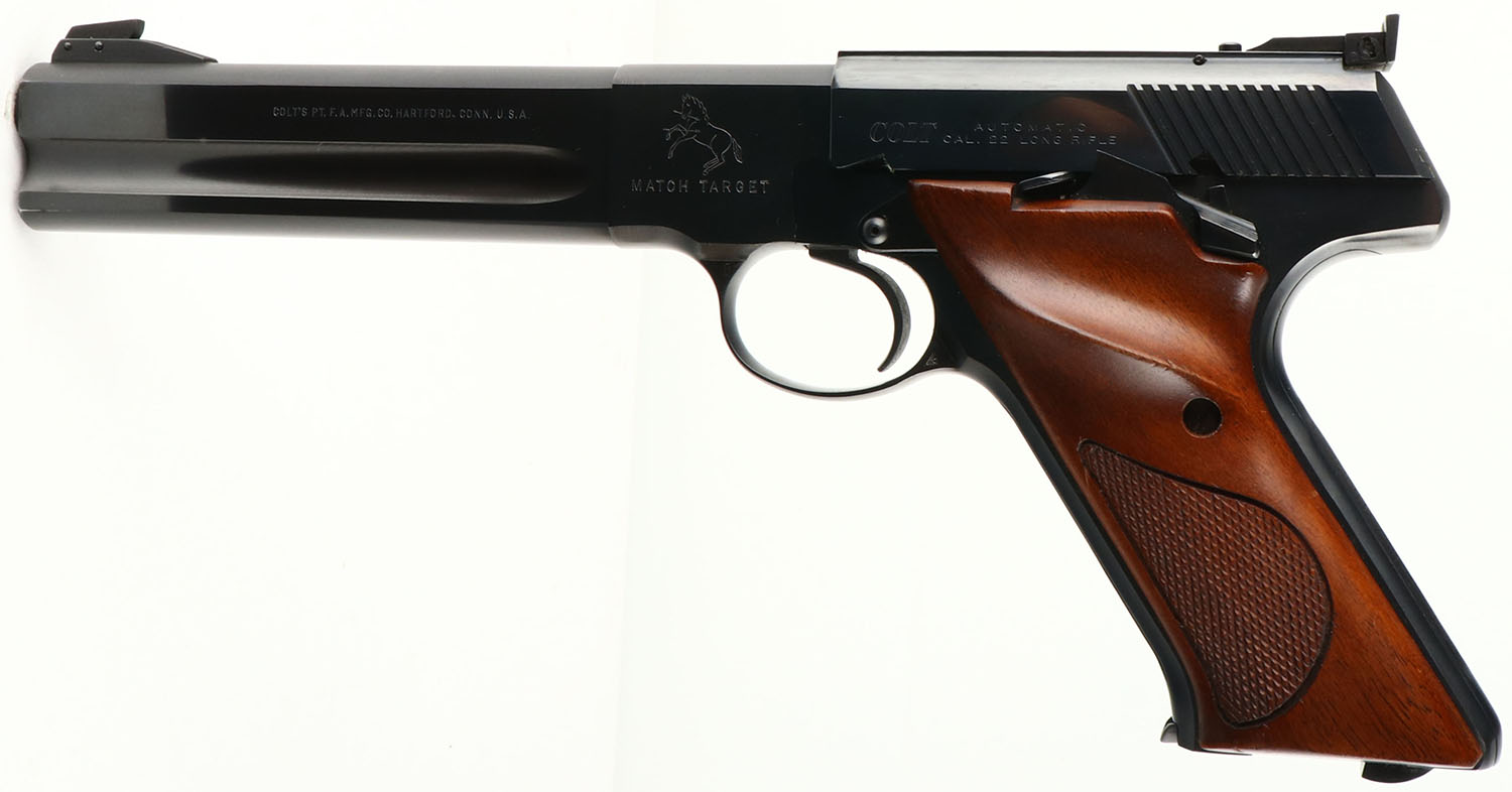 Colt, Woodsman Match Target, CAL: 22 LR, MFG: 1967, SN: 217296-S, Semi Auto Pistol, 6'' barrel. The original, thumb rest & checkered wood grips are excellent. There are only a couple minor handling marks to the finish. The metal blue finish rates 99% overall. The left side of the barrel is marked ''COLT'S PT. F.A MFG CO HARTFORD CT USA'', the left side of the frame is marked with the Rampant Colt over ''MATCH TARGET''. The left side of the slide is marked ''COLT'', & in two lines ''AUTOMATIC CAL .22 LONG RIFLE''. Bore is excellent, with crisp rifling. The slide carries a ELLIASON adjustable rear sight & ramp elevated blade front sight. Colt marked detachable mag. This collectible 3rd series Match Target has an overall excellent appearance, showing little to no use. FFL or C&R Req. - Value: 1200 to 2000