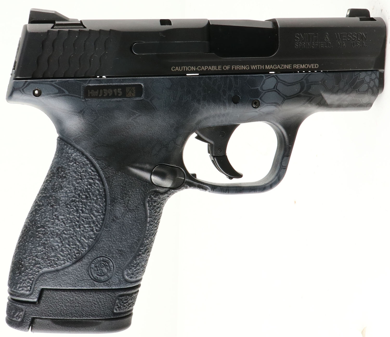 Smith & Wesson, M&P 9 Shield, CAL: 9mm, MFG: Modern, SN: HWJ3915, Semi Auto Rifle, 3'' barrel. The Talo Exclusive Kryptek Typhon Camo textured polymer grip frame is excellent. The matte black finish on the slide rates 99%+. Bore is excellent. Factory sights. A cool variant of the M&P 9 Shield. FFL Req. - Value: 350 to 550