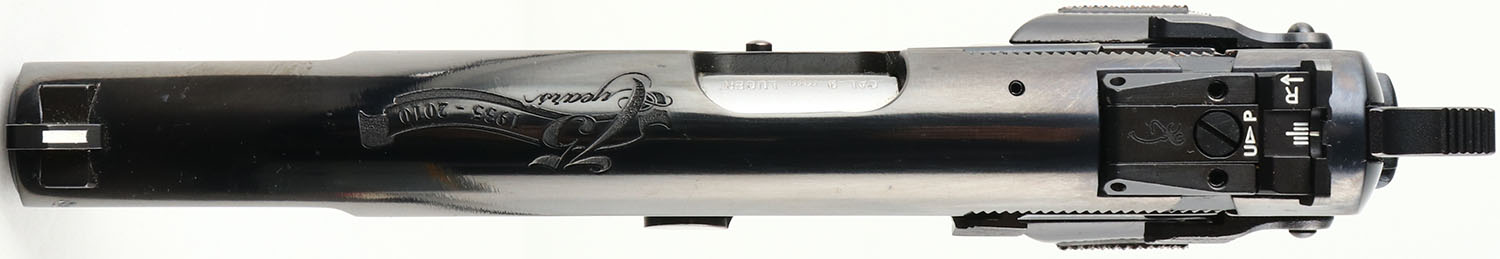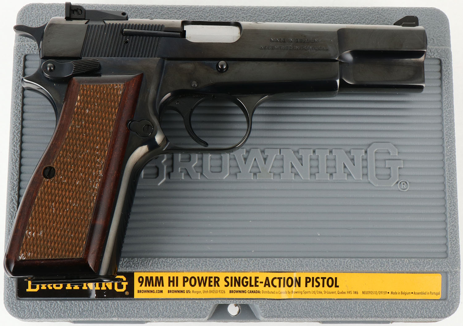 CASED, Browning (Belgium) Model ''Hi-Power'', 75th Anniversary Edition, CAL: 9mm, MFG: 2010, SN: 511ZM51529, Semi Auto Pistol, 4 5/8'' barrel. The checkered wood grips are excellent with light surface wear to checkering. The polished metal blue finish is 98%. Bore is excellent. The slide carries an adjustable rear & fixed front sight. Comes in factory case, comes with extra magazines, tool, lock & related paperwork, NOS. FFL Req. - Value: 1000 to 2000