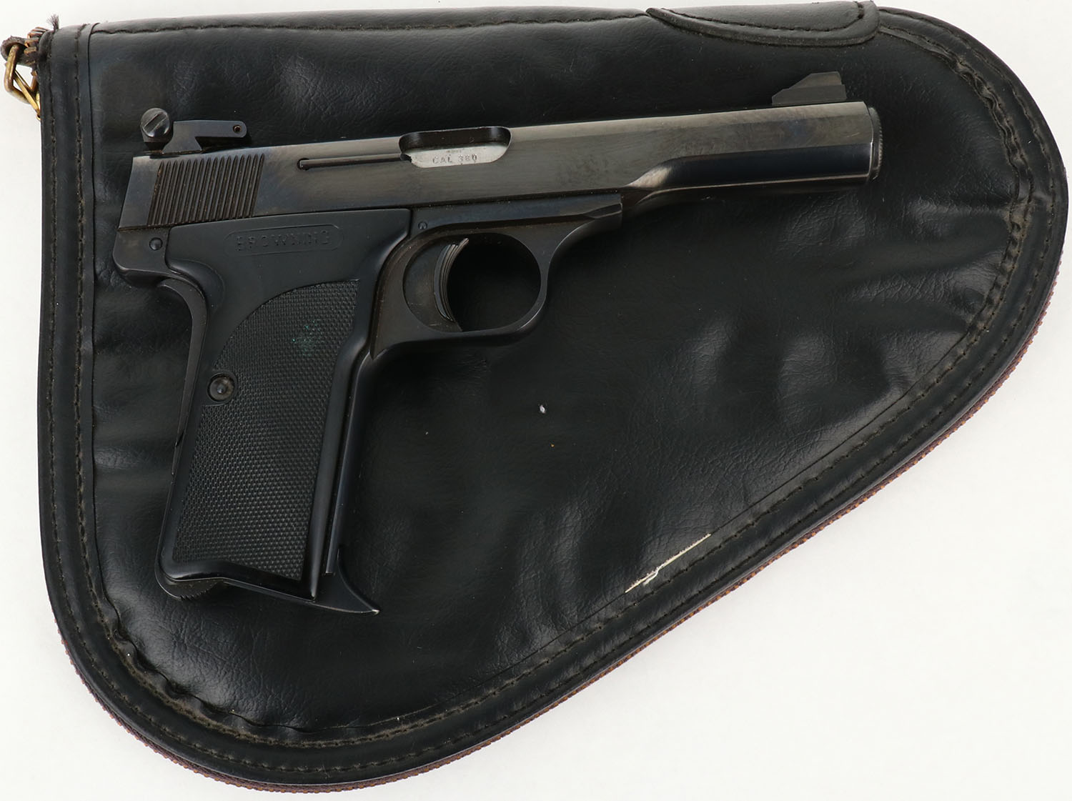 Browning (Belgium) Model 10/71, CAL: 380, MFG: 1971-74, SN: 71N02185, Semi Auto pistol, 4 3/8'' barrel. The Browning marked plastic checkered grips are excellent with light surface wear to edges. The polished metal blue finish rates 98%. Bore is excellent. The slide carries an adjustable rear & fixed front sight. Has (1) 6 round mag. Comes with a black Browning soft case. FFL Req. - Value: 400 to 800