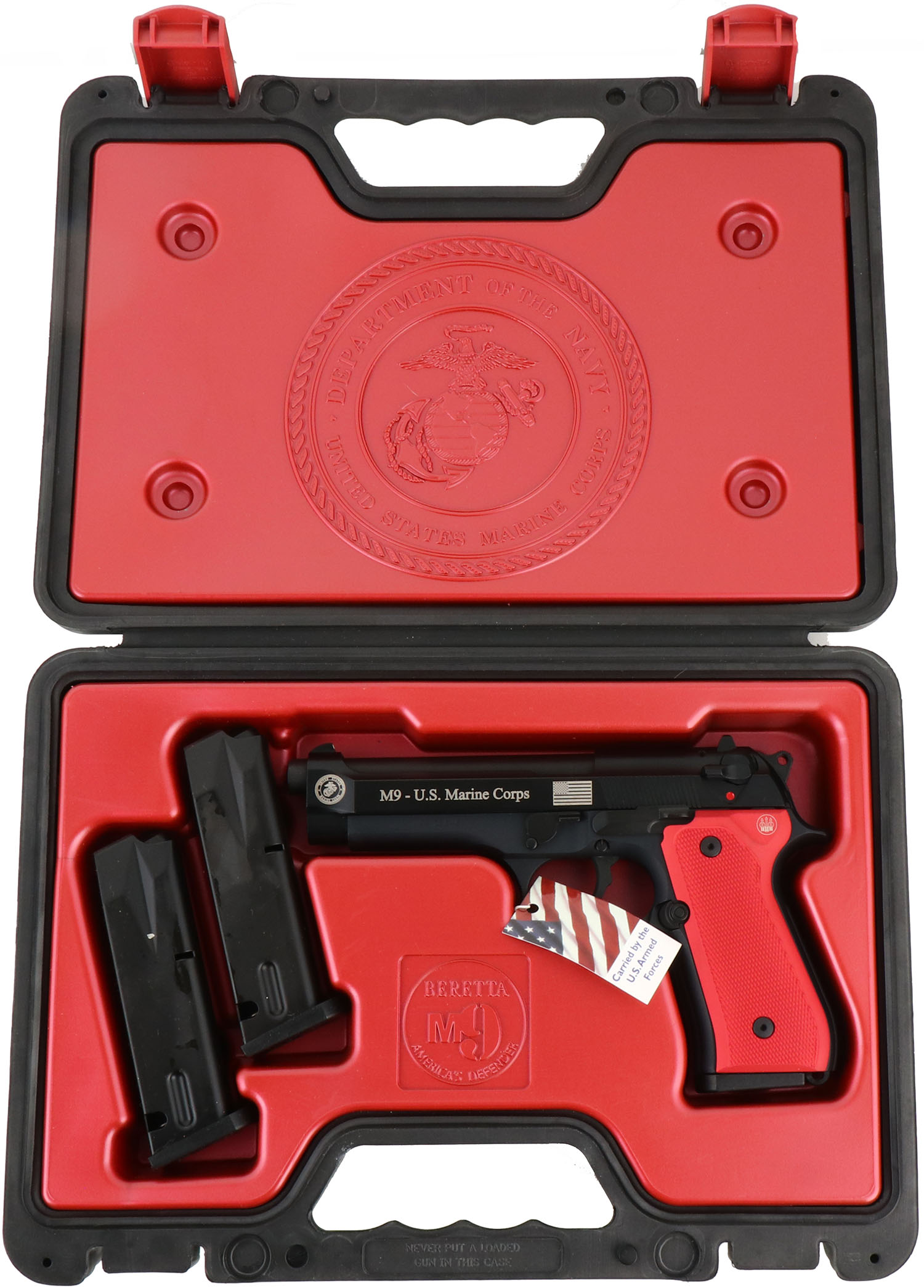 NEW CASED, Beretta, Model M9 U.S. MARINE CORPS, CAL: 9mm, MFG: Modern, SN: M9-123046, Semi Auto Pistol, 4 3/4'' barrel. The factory red aluminum grips are mint. The factory matte black finish is mint with US Flag & Marine logo on left side of receiver, white dot rear sight & single white dot front sight. Comes in factory hard case, with owners manual, brochure, extra black grips, & (3) 15rd mags. FFL Req. - Value: 700 to 1000