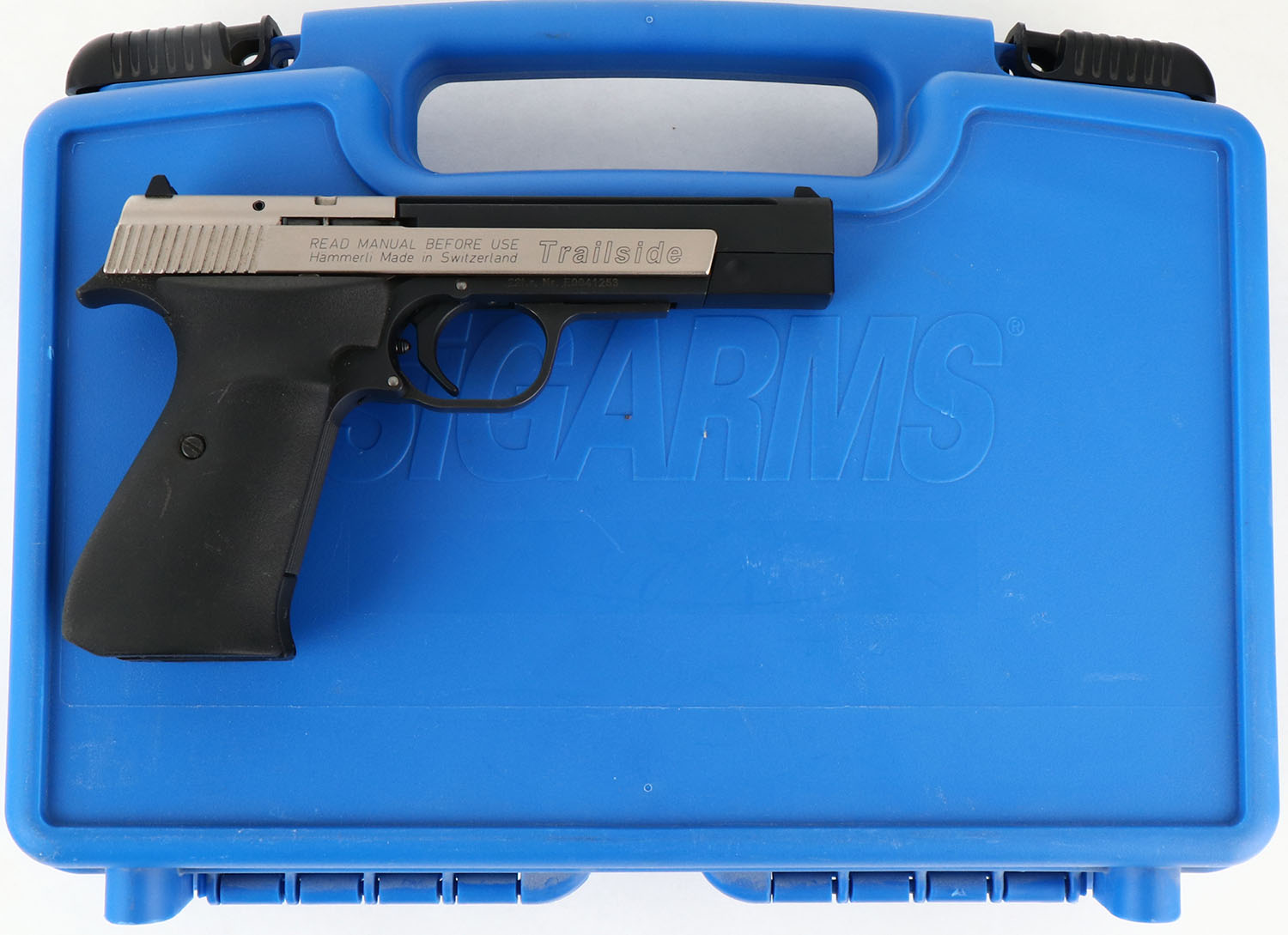 CASED, Sig Arms, Model Trailside, CAL: 22LR, MFG: Modern, SN: E0041253, Semi Auto Pistol, 4 1/2'' barrel. The synthetic grips are excellent, with light handling marks. The original matte black finish on the barrel rates 99% & the stainless steel finish on the slide is excellent. Bore is excellent. Factory sights. Comes with hard case, (2) 10rd mags. & paperwork. FFL Req. - Value: 300 to 600