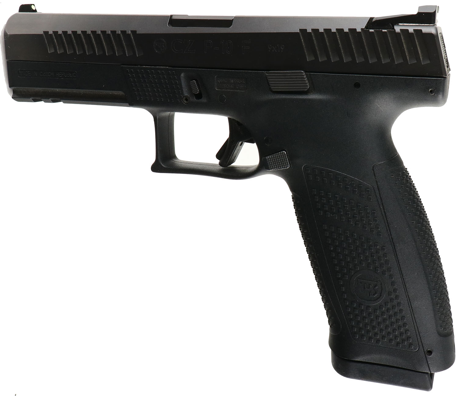 CASED, CZ, Model P-10 F, CAL: 9mm, MFG: Modern, SN: C840399, Semi Auto Pistol, 4 3/8'' barrel. The textured polymer grip frame is excellent. The factory matte black finish on the slide rates 99%. Bore is excellent & minty. Factory sights. Comes in factory hard case, with owners manual, cleaning rod, extra grip attachment, lock/key. FFL Req. - Value: 450 to 600