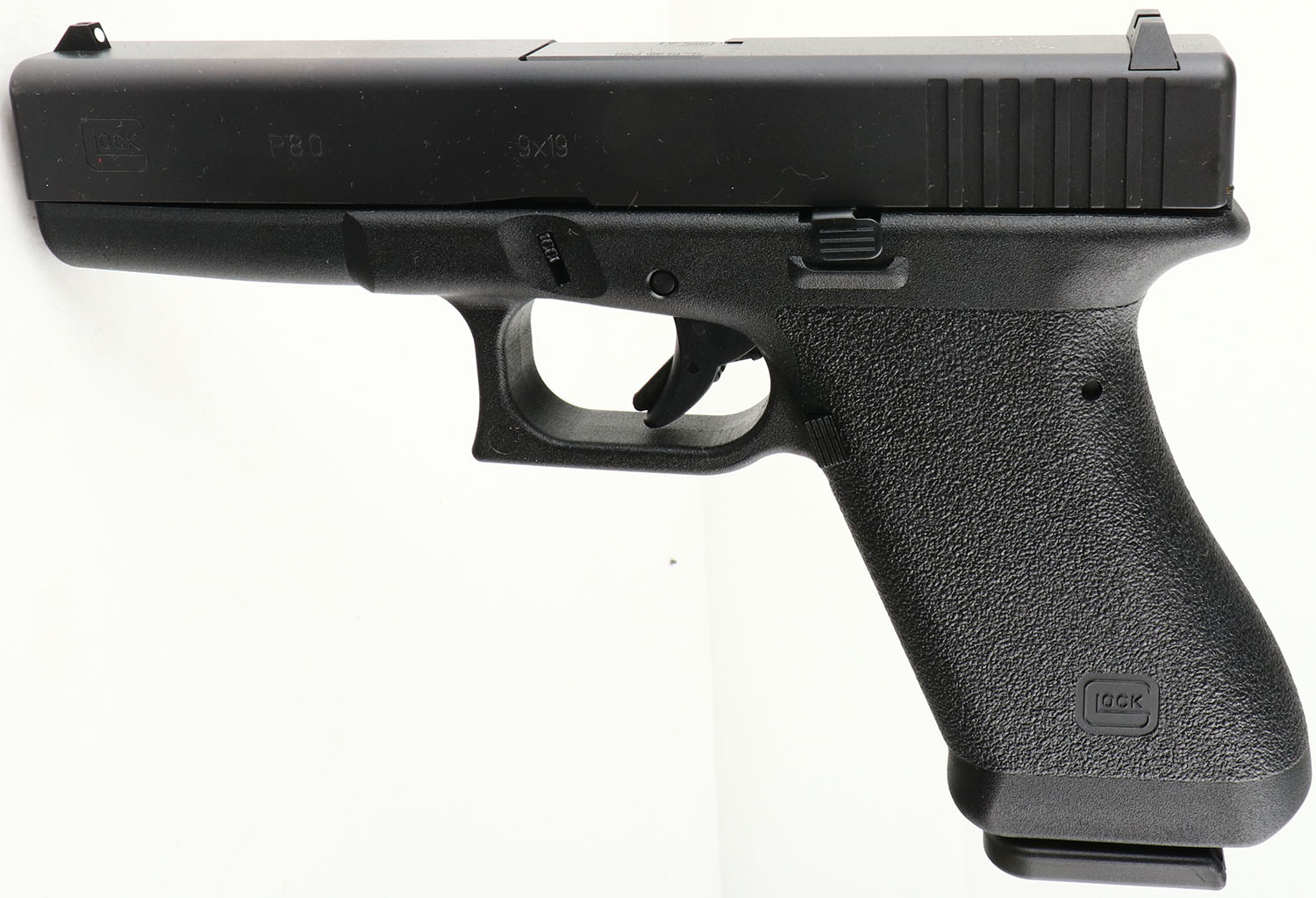 BOXED, Glock Perfection, Model P80 Classic Edition, CAL: 9mm, MFG: Modern, SN: BRCU810, Semi Auto Pistol, 4 3/8'' barrel. The textured polymer grip frame is excellent & minty. The factory matte black finish on the slide rates 99%+. Bore is mint. Factory sights. Comes in Glock Perfection box, with hard black case & included in the case is an extra mag, speed loader, related paperwork & cleaning brush. FFL Req. - Value: 500 to 700