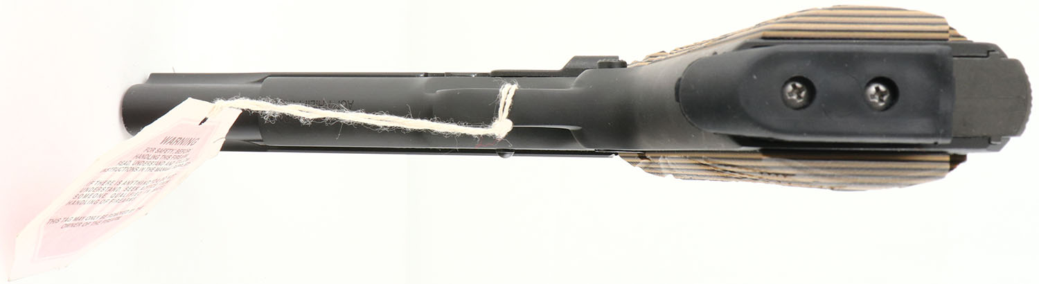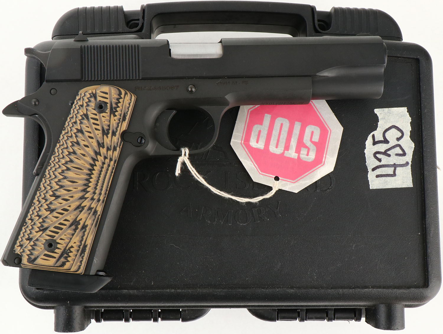 CASED, Rock Island, Model 1911A1-FS, CAL: 10mm, MFG: Modern, SN: RIA2445087, Semi Auto Pistol, 4 7/8'' barrel. The factory tan/black textured grips are excellent. The factory matte black finish rates 99%+ overall. Bore is excellent. Factory sights. Comes in factory hard case, with owners manual, test fire cartridge & lock/key. Gun store inventory, NOS. FFL Req. - Value: 600 to 800