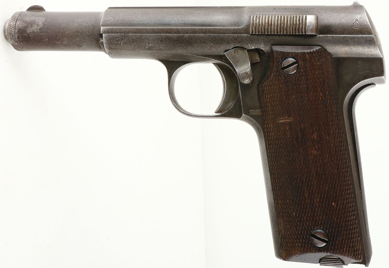 Astra, Model 600/43, CAL: 9mm Para, MFG: 1944, SN: 21355 Semi Auto Pistol, 5 1/4'' barrel. The original checkered walnut grips are excellent, with a couple minor scrapes & dings. The metal blue finish has worn to a mix of metal gray & a thin spotty layer of a brown patina. Bore is excellent. The slide has a fixed notch rear sight & blade front sight. SN matching Astra marked detachable mag, which is extremely rare to still retain the original SN matching mag. The front grip strap is property stamped ''LBPN'' (Landesbereitschaftspolizei Niederschsen), which was the postwar Lower Saxony Barracked Police. Missing Lanyard loop. In late 1943, examples of the newly designed Astra 600 were sent to Germany & were approved for issue to German armed forces, receiving the designation Pistole Astra 600/43. The Astra 600's that could not be delivered to the German government during World War II were then stored by the Spanish government. Small quantities of pistols were sold to Turkey, Portugal, Chile, & Costa Rica until 1951, when the remaining Astra 600's were sold to West Germany. Those pistols were extensively used by West German police forces until the late 1960's when Interarms purchased the remaining pistols for export to the United States civilian market. FFL or C&R Req. - Value: 250 to 450