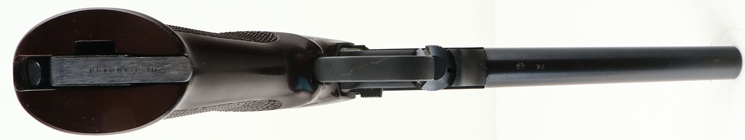 BOXED High Standard, Model M-101 Dura-Matic, CAL: 22 LR, MFG: 1966-67, SN: 1768136, Semi Auto Pistol, 6 1/2'' barrel. The checkered plastic grips are excellent, with light handling wear. The metal blue finish rates 98% overall, with a couple minor areas of speckling. Bore is excellent. The barrel holds a serrated blade front sight & the slide has a fixed notch rear sight. ''HI-STANDARD'' marked magazine, with green follower. Comes in original SN matching box, with all of the original paperwork. FFL or C&R Req. - Value: 300 to 600