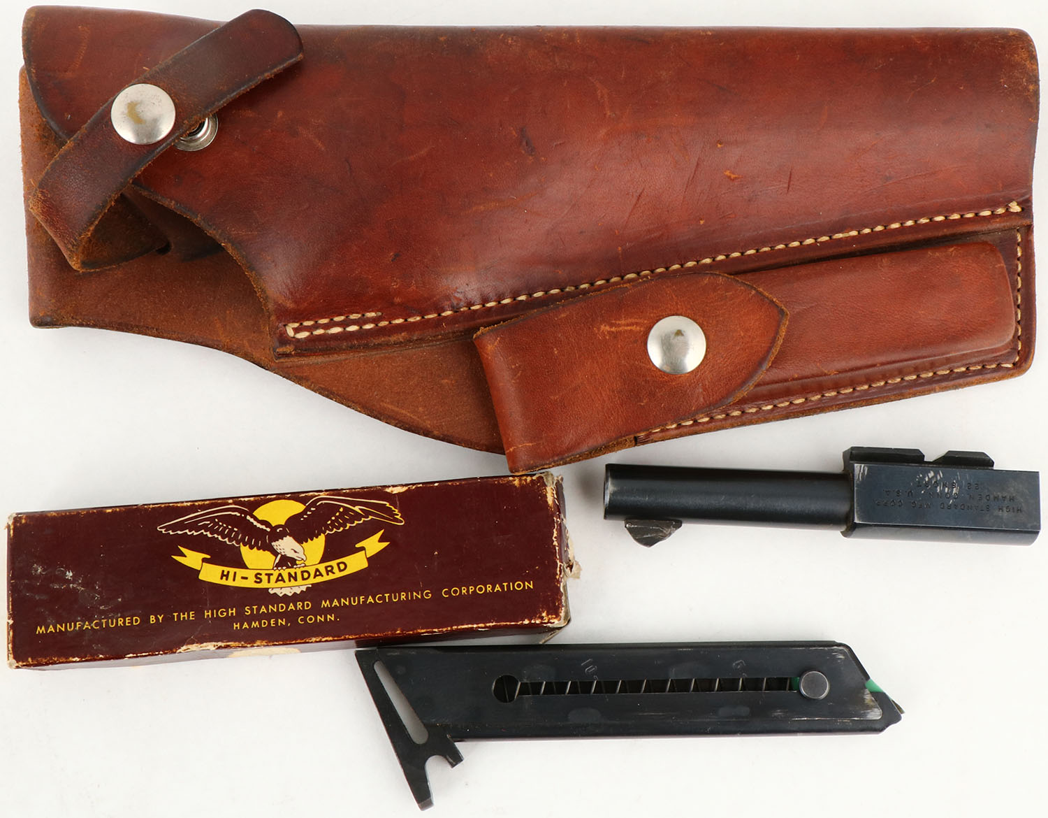 High Standard, ''Field King'', CAL: 22LR, MFG: 1953, SN: 419646, Semi Auto Pistol, 6 3/4'' barrel. The original HS checkered plastic grips, with thumb rest, are excellent. The original metal blue finish rates 95% overall. Bore is excellent & bright. The slide carries an adjustable rear sight & the barrel has a serrated blade front sight. Comes with an extra barrel (4 1/2'') marked ''FLITE KING'', a boxed original High Standard magazine & George Lawrence leather holster that also holds a 3rd non-marked mag. FFL or C&R Req. - Value: 300 to 600