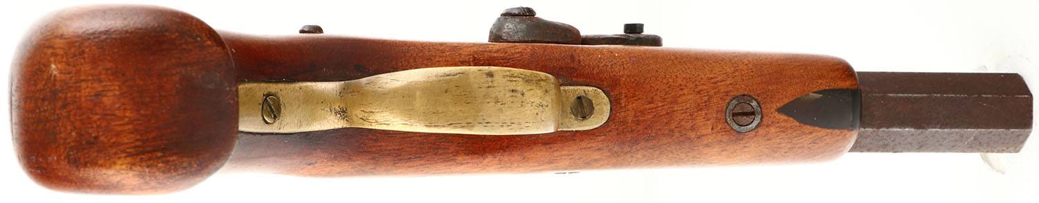 Unknown, Percussion Pistol, CAL: .42 cal, MFG: unknown, SN: NSN, Single Shot Black Powder Muzzleloader Pistol, 7 1/2'' octagon barrel. The original wood stock is excellent, with inlaid ebony at the forend tip. There are few tiny contusions to the original finish. The metal finish has fully toned to a brown patina, with rust speckling. Bore has good rifling, but with lots of brown rust pitting. The barrel holds a fixed notch rear sight & small blade front sight. All appears to function properly. Black Powder. No FFL Req. - Value: 50 to 200