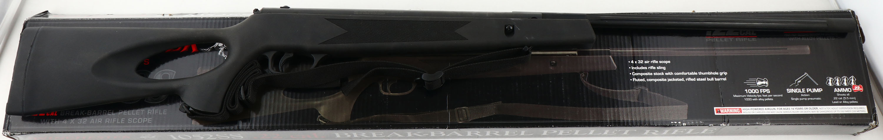 Winchester, Model 1052SS, .22 Caliber Pellet Rifle, Single Pump Break-Barrel, 1000 FPS, 19'' Barrel, Black Plastic Thumbhole Stock, 4x32 Air Rifle Scope, Scope is minty and comes with lens covers, rings & allen key for mounting, bore is minty, comes in original box with manual & sling. Grade: Excellent ++ - Value: 50 to 150