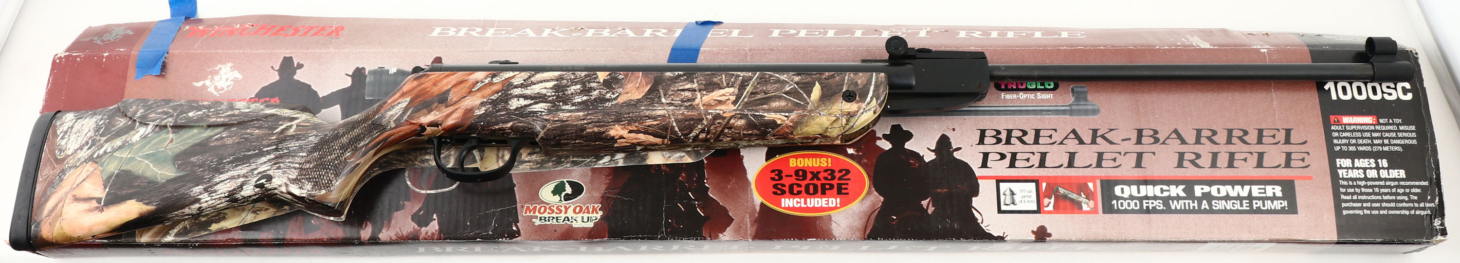 Winchester, Model 1000SC, .177 Caliber Pellet Rifle, Single Pump Break-Barrel, 1000 FPS, 17 3/4'' Barrel, Mossy Oak Camoflauged Plastic Stock, Adjustable fiber-optic rear sights & hooded front sight post, 3-9x32 Variable Magnification Air Rifle Scope, Scope is minty and comes with lens covers & rings, bore is minty, comes in original box with manual. Grade: Excellent ++ - Value: 50 to 150