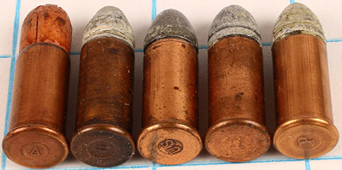 Lot of 5 SCARCE R/F H/S H/S= (raised) ''U'', 38 short R/F COP. CS. R.N.L. 1-GR. H/S= (raised) ''P'', 38 short R/F COP. CS., conical FLT. TIP LD. Belted H/S= (raised) ''A'', 38 short, shot load, tan paper sabot H/S= (raised) ''H'', 38 short R/F COP CS., R.N.L. 1-GR. H/S= (raised) ''U.S.'' 38 short R/F COP. CS. R.N.L. belted. Grade: Excellent - Value: 40 to 70