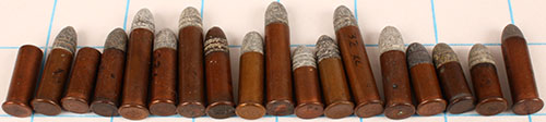 Lot of 18. .32 Rimfires. (4) 32 Extra Long, HS: 1 raised ''H'', 1 ea. Impressed ''U'', ''H'', ''US''. (1) 32 Long Rifle, HS: impressed ''U''. (9) 32 Long, HS: (1) raised ''H'', (2) impressed ''D'' and ''diamond shape'', (4) HS: NHS--1 dished base, (1) shot load by Winchester, (1) blank by UMC. (4) 32 Shorts, HS: (2) HS ''impressed ''D'' & ''U'', (2) NHS. Grade: Excellent - Value: 50 to 100