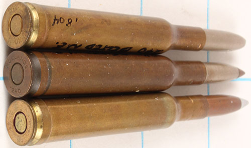 Lot of 3 .240 Nitro: (2) HS''KYNOCH 240'', (1) RN CN SN. (1) PT CJ silvertip. (1) HS:''HOLLANDS 240'', PT CN coppertip. - Value: 20 to 40
