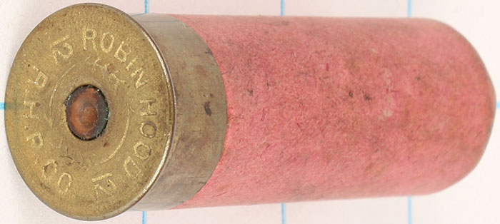 H/S= ''Robin Hood 12 ga, R.H.P.CO'' 2 7/16'' OAL. Fired empty red case. Grade: Very Good ++ - Value: 6 to 40