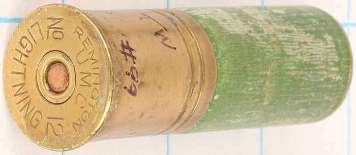 H/S= ''Remington UMC Lightning No 12'' 2 7/16'' OAL. Loaded green paper case. Grade: Excellent - Value: 6 to 30