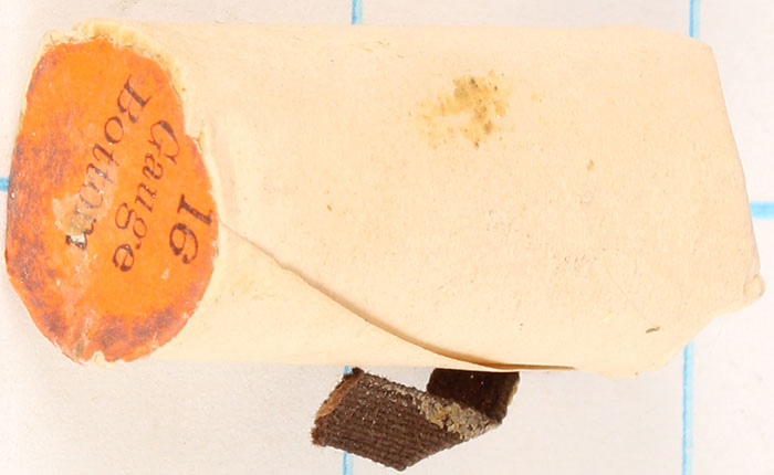 Early Eley's wire and concentrator shot loads. The Eley Brothers began designing shot in the 1800s in London and the company is still in business today and located in Birmingham. Civil Wire Paper wrapped Eley 16 gauge wire shot shell. Base of the cartridge is marked: 16 / GAUGE on an orange tag. Grade: Excellent - Value: 10 to 60