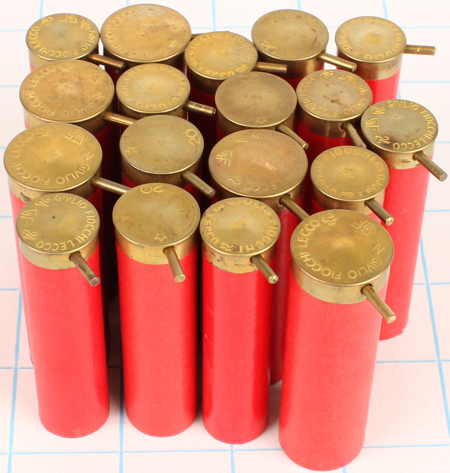 | Large lot of empty pinfire shotshells, red paper cases. Grade: ...