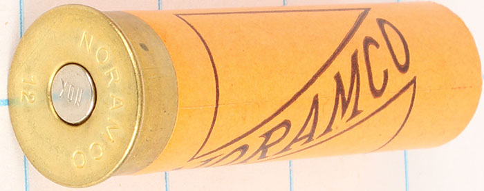 H/S= ''NORAMCO 12 ga'' 2 3/4'' OAL, N.P.E. orange paper case. Grade: Excellent - Value: 6 to 30