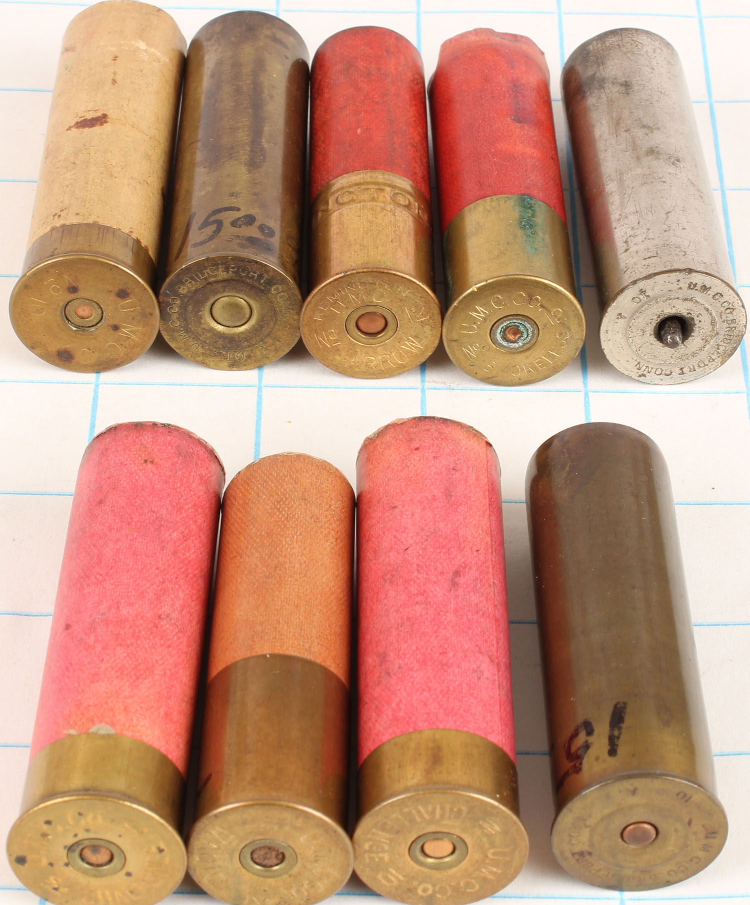 Lot of 9 (3) U.M.C.CO. Bridgeport, Conn. (1) U.M.C.CO. Magic No 12, new primed MT, red paper cases. (2) U.M.C.CO Challenge No 10 N.P.E. red paper cases. (1) U.M.C. Smokeless 12ga red paper PRI (fired) (1) Remington UMC Arrow No 12 N.P.E. red paper (1) U.M.C.CO. 10 ga N.P.E. tan paper case. Grade: Very Good ++ - Value: 10 to 50