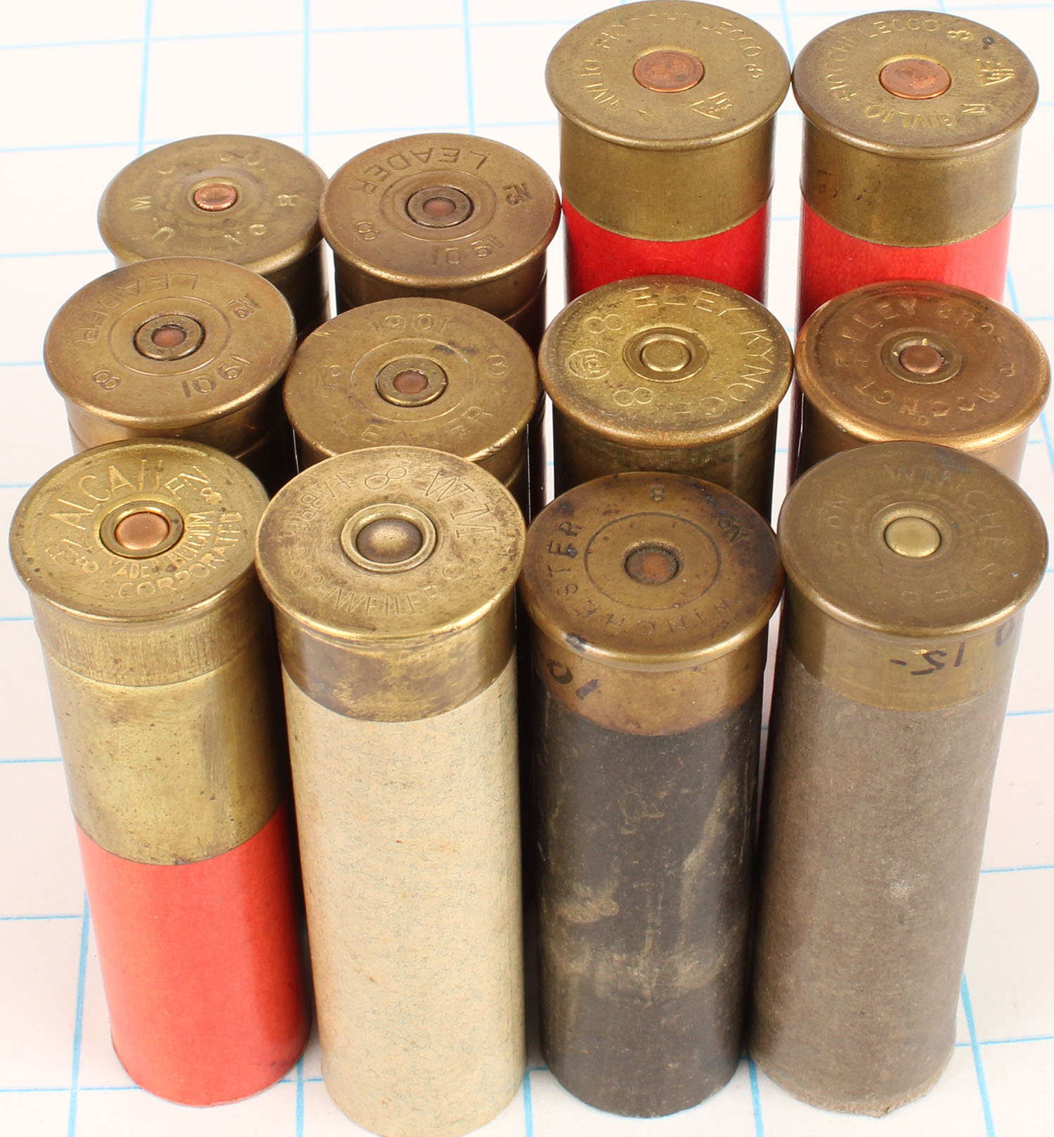 Lot of 12 empty shotshells, 8ga, mixed H/S. Grade: Very Good ++ - Value: 2 to 100
