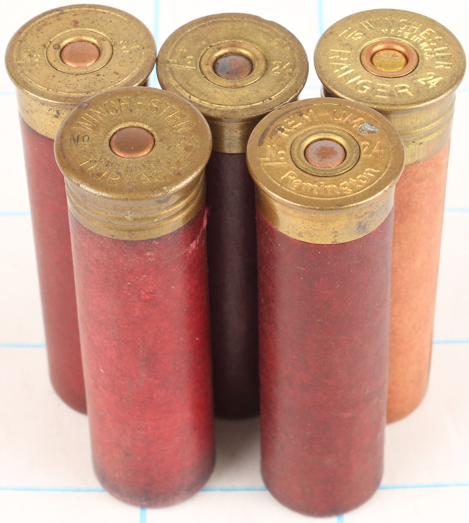 Lot of 5 loaded shotshells in paper cases, mixed H/S, 24ga, 2 3/8'' OAL. Grade: Excellent - Value: 6 to 30