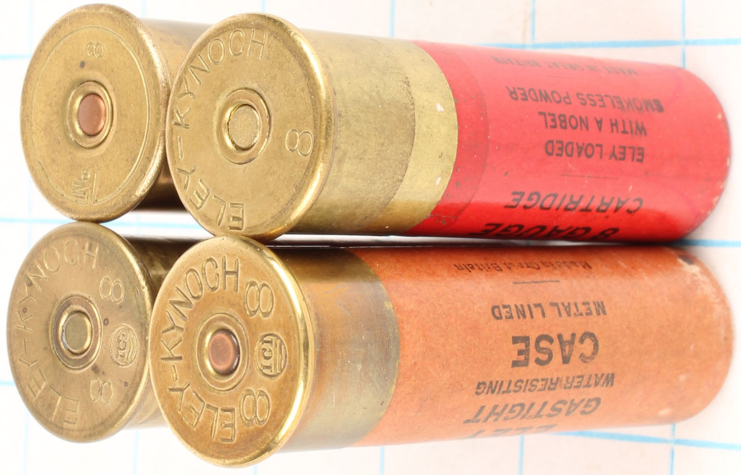 | Lot of 4 loaded paper shotshells, 8ga, 3 1/16'' OAL. Grade: V...