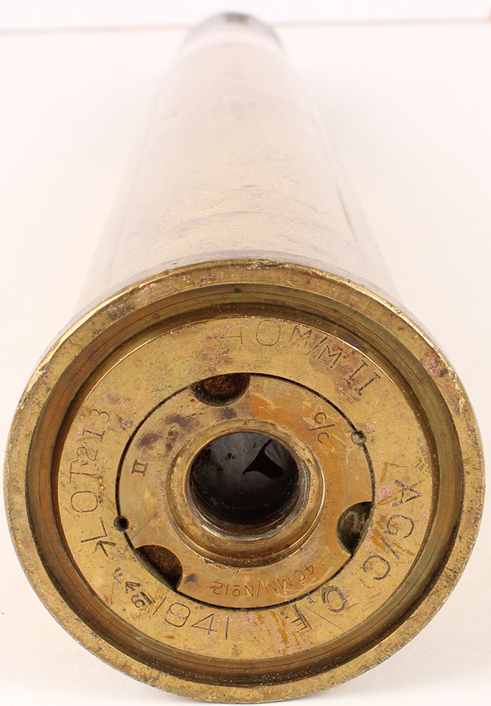 Bofors, 40mm Mk2 shell with fake replaced projectile, H/S: ''40M/M II'', ''AG/C C.F.'', ''1941'', ''LOT 213'', OAL: 17 1/2''. Grade: Excellent + - Value: 10 to 100