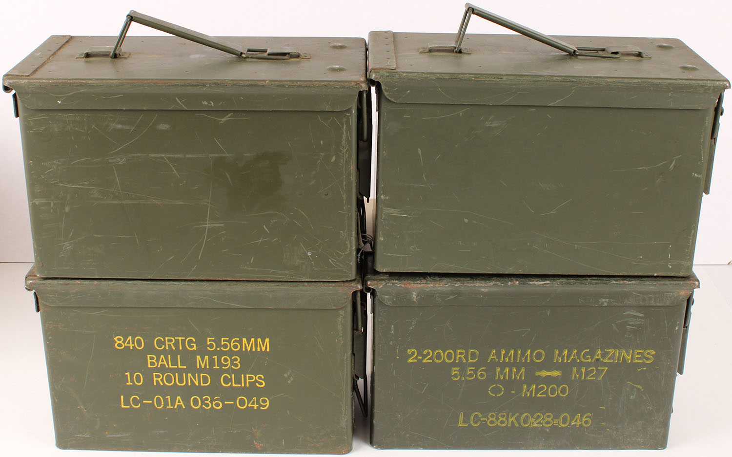 Lot of 4, M2A1 5.56 Cal Military ammo cans, All empty, Insides of the cans are clean with no rust. Grade Very good ++ - Value: 30 to 60