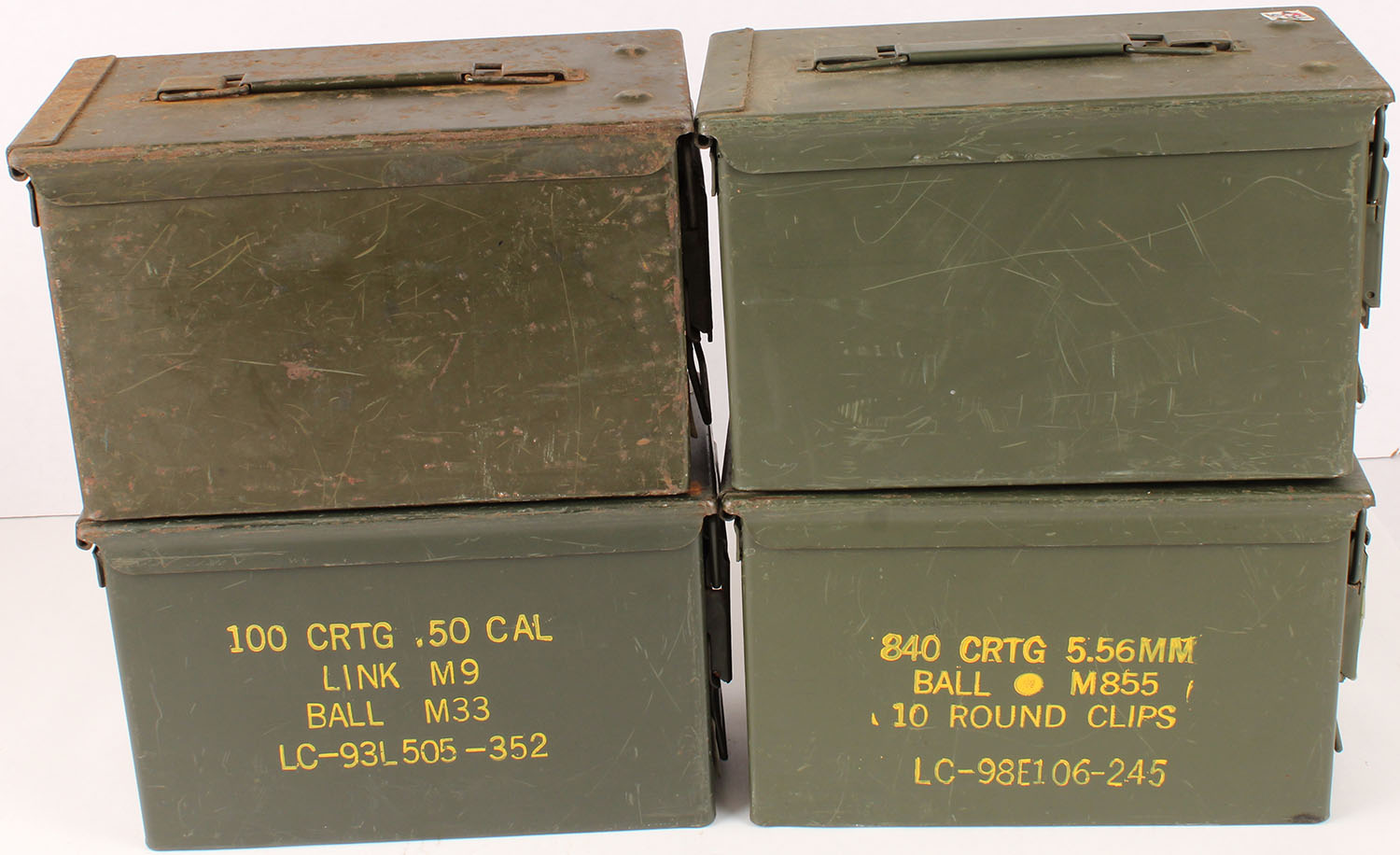 Lot of 4, M2A1 .50 Cal Military ammo cans, All empty, Insides of the cans are clean with no rust. Grade Very good + - Value: 30 to 60