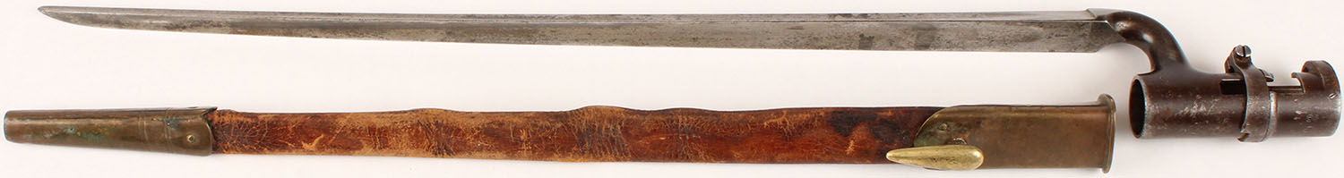 British, Pattern 1876 bayonet, blade is marked with proof stamping, blade has gray patina, comes with brass & leather sheath, part of back seam on the leather has been torn. Grade: Excellent - Value: 100 to 300
