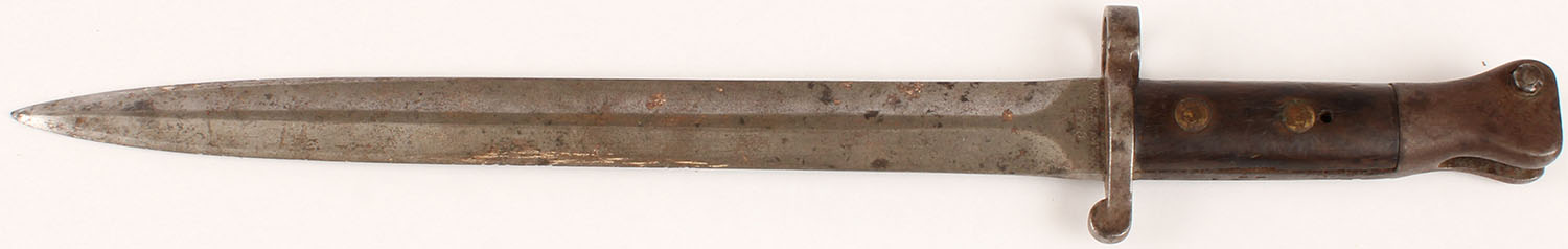 British/Wilkinson, Pattern 1888 Bayonet MK 1 type 2, left side of blade is marked with a crown over ''V.R.'', ''9.33'', ''WILKINSON LONDON'', Right side of blade is marked with proof marks, blade has small nicks, wear from sharpening, patina & light rust spots. Grade: Very Good + - Value: 40 to 120