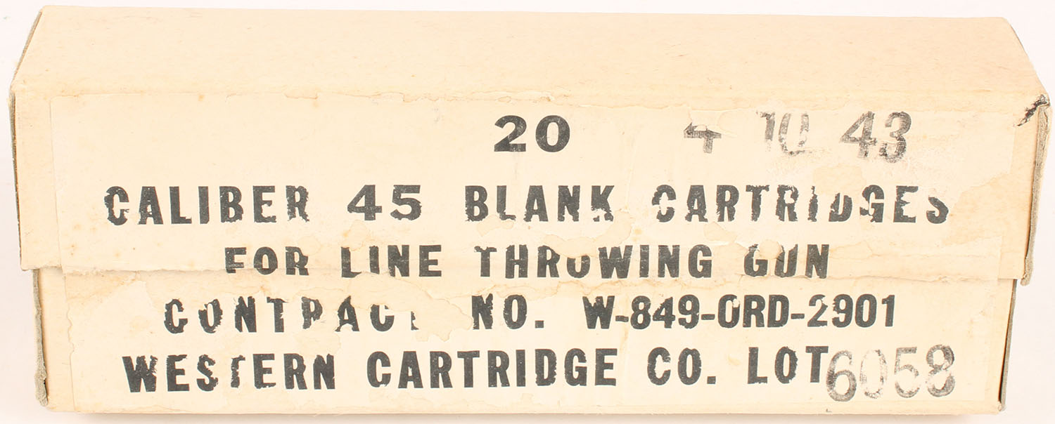 Western, .45 Blank Cartridges for line throwing gun, Lot 6058, 2pc, FULL & SEALED, white box & label with black print, box is solid with rub marks, handling wear, & small tears in front label. Grade: Very Good + - Value: 20 to 60