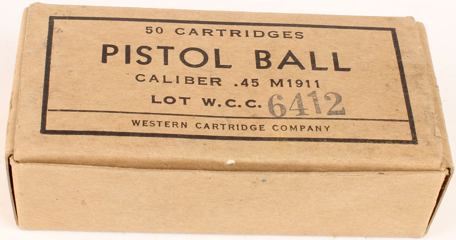 Western, .45 M1911 Pistol Ball, Lot W.C.C. 6412, 2pc, Full, buff box with black print, box is solid with light run wear & light edge wear, ammo is very good. Grade: Excellent + - Value: 20 to 50