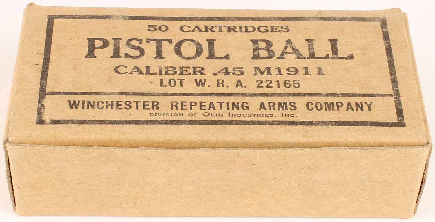 Winchester, .45 M1911 Pistol ball, Lot W.R.A. 22165, 1pc, Full, buff box with black print, box is solid with light rub marks, ammo is excellent. Grade: Excellent + - Value: 30 to 60