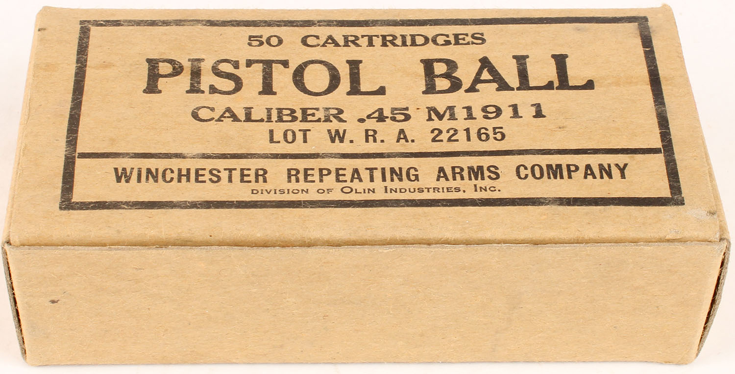 Winchester, .45 M1911, Pistol Ball, Lot W.R.A. 22165, 1pc, Full, buff box with black print, box is solid with light rub marks & light edge wear, ammo is excellent. Grade: Excellent - Value: 20 to 50
