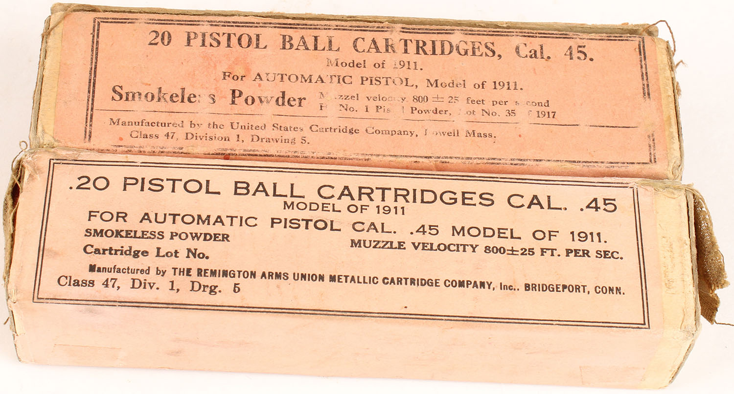 Lot of 2, .45 Pistol ball Model of 1911, rem-umc & US. Cart. Co., 1pc, both FULL & SEALED, boxes are solid with rub wear & age soiling. Grade: Very Good ++ - Value: 20 to 50