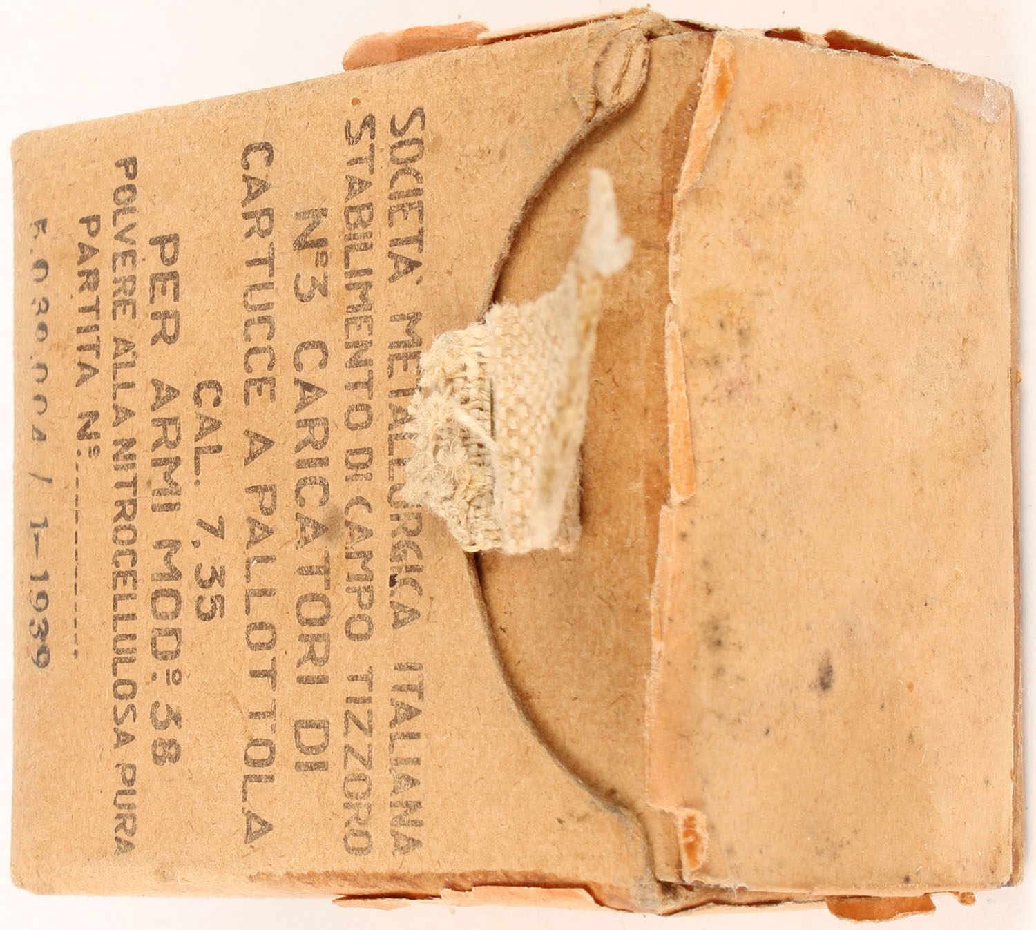 Societa Metallurgica Italiana, 7.35x51mm Carcano, in stripper clips, 1939 dated, 1pc, Full, brown box with black print, box is solid with age soiling, rub marks, & edge/corner wear, ammo is very good. Grade: Very Good ++ - Value: 20 to 60