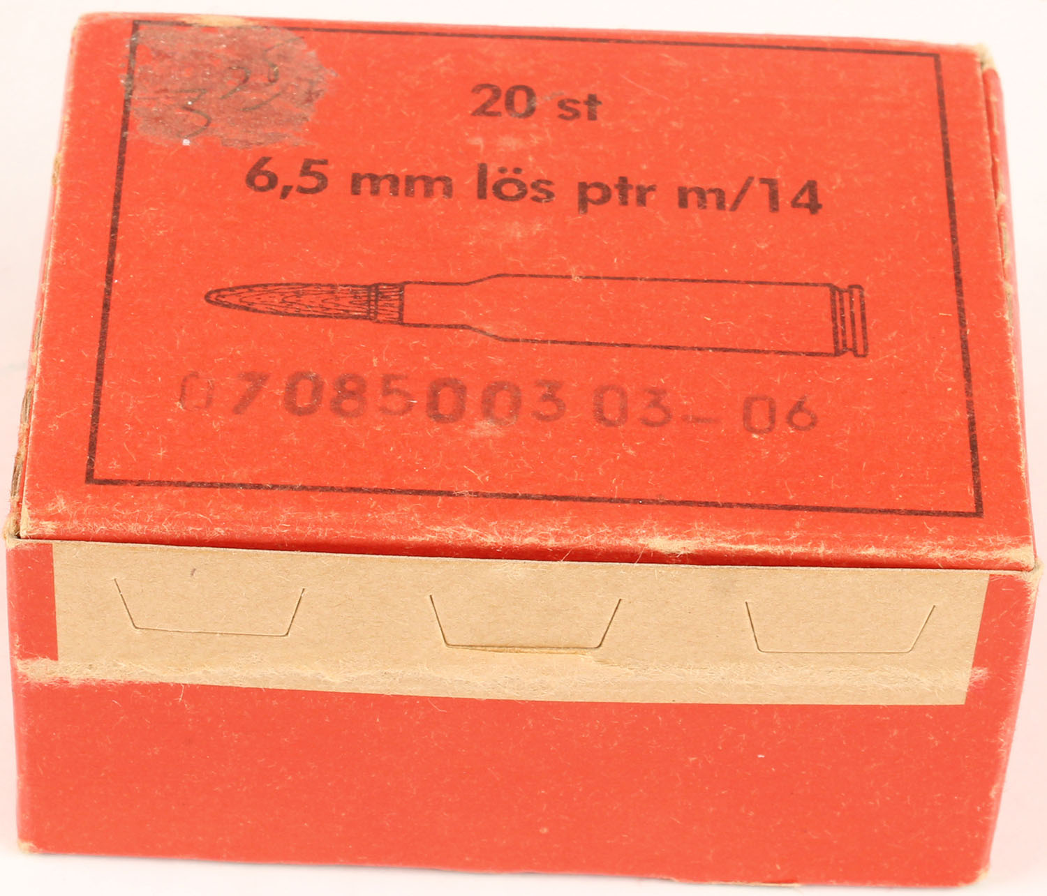 Swedish, 6.5mm Los ptr M/14 (6.5 Swedish wooden bullet blanks), 1pc, Full, orange box with black print, box is solid with sticker mark, pen marks, light rub marks, & light edge wear, ammo is very good. Grade: Excellent - Value: 10 to 30