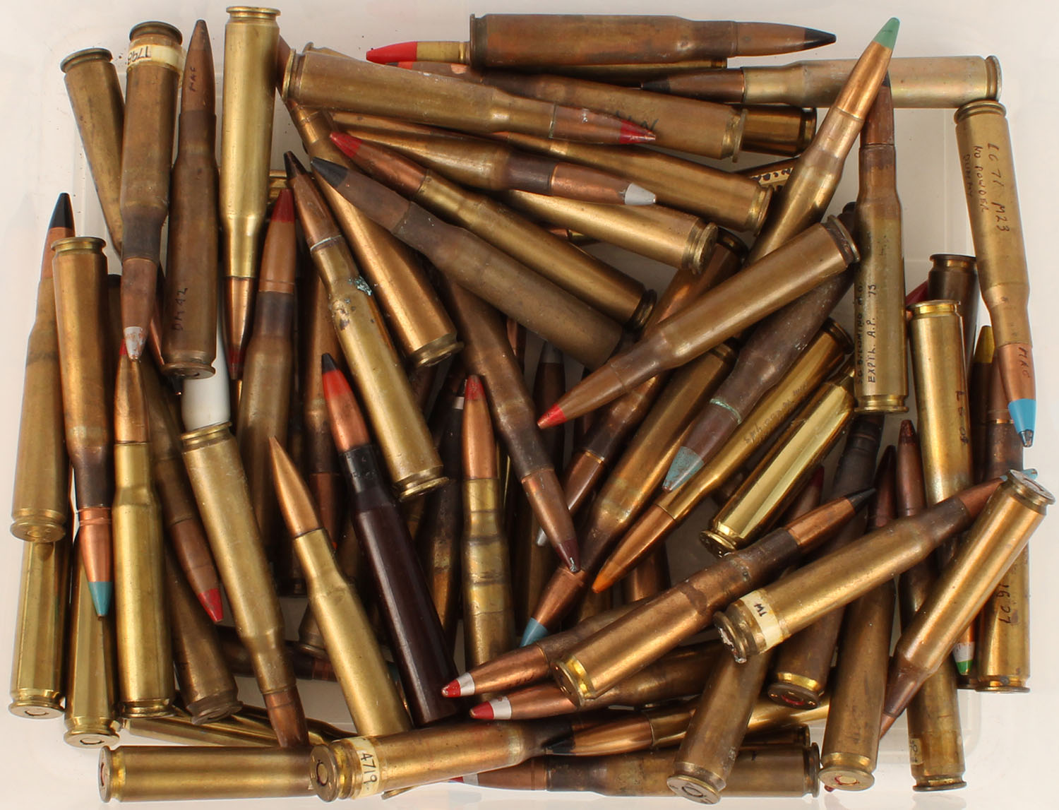 Large Lot of live .50 BMG painted tip Rds., mixed MFG. Grade: Very Good ++ - Value: 50 to 200