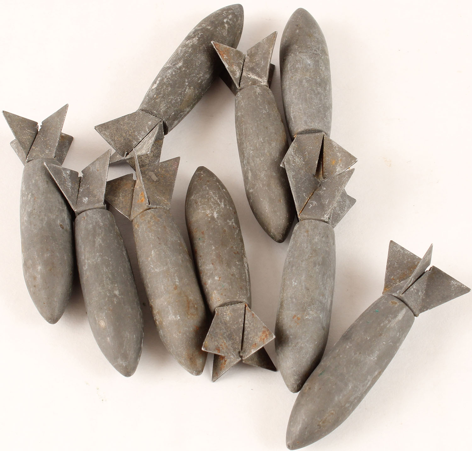 Lot of 9, Lazy Dog Bombs, they contain no explosive, but instead used kinetic force when there were dropped to penetrate & destroy its target, or wipe out personal, they used these instead of normal bombs because they would not leave any unexploded bomb on the ground that could be active for years after the conflict. Grade: Excellent - Value: 20 to 60