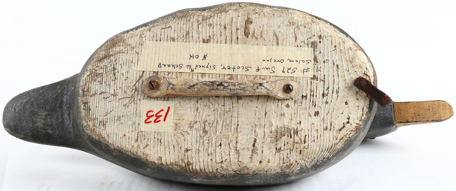 Surf Scoter by R.W. Schaap, Glass eyes, hollow wood, original paint, leather line tie, structurally excellent. Grade: Excellent - Value: 100 to 300