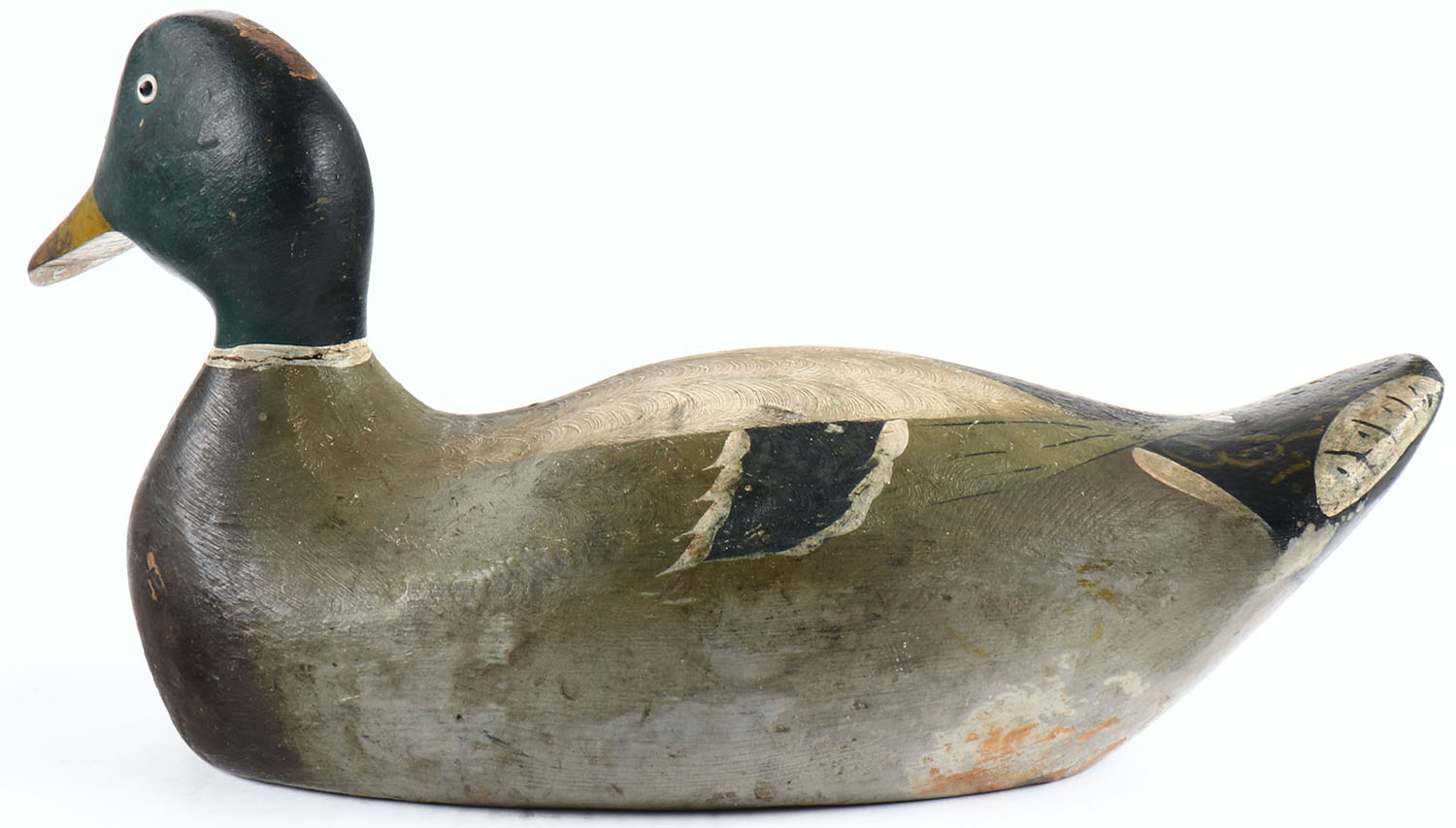 Mallard drake by Pratt Decoy Co., glass eyes, hollow body, original paint shows swirl pattern on back, some wear to top of head & right side of body, structurally excellent. Grade: Excellent - Value: 100 to 300