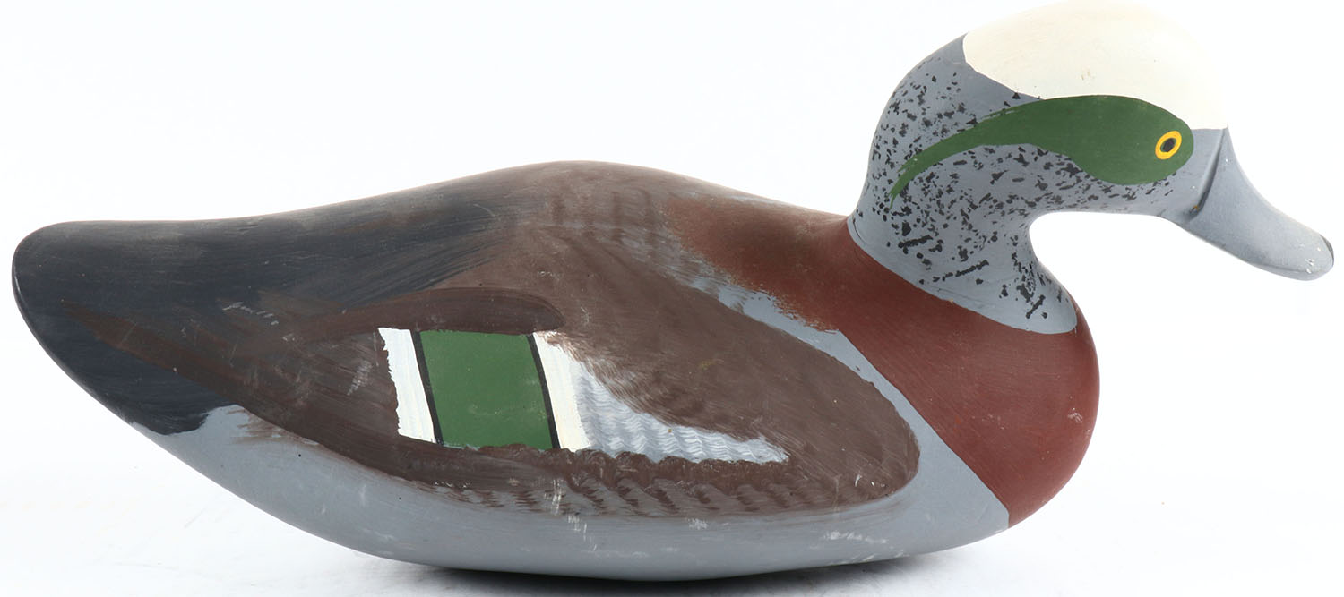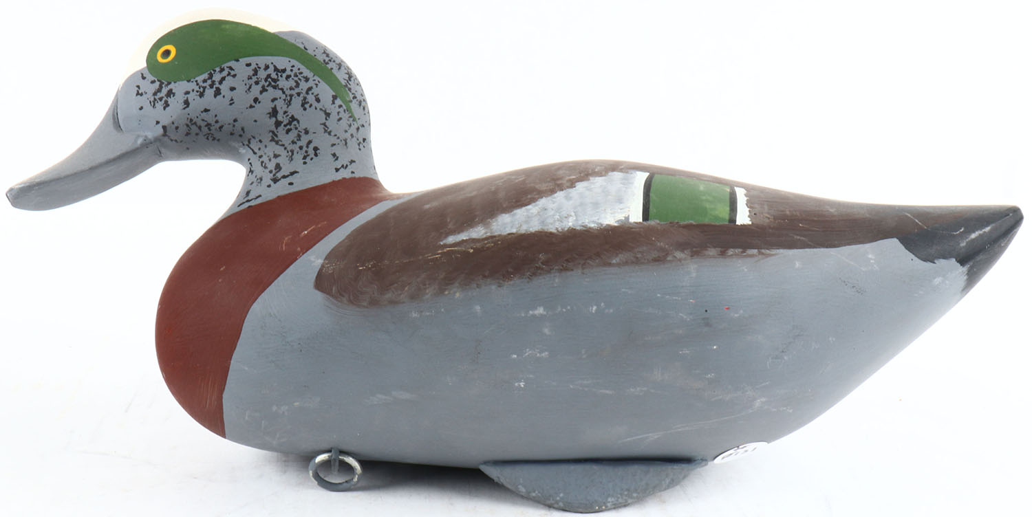 Widgeon Drake by Capt. Harry R. Jobes, Havre de Grace, MD, solid wood, painted eyes, excellent original paint, structurally excellent, bottom is signed. Grade: Excellent + - Value: 100 to 200