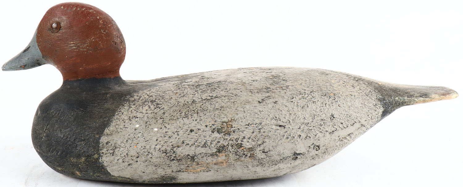 Redhead Drake by unknown maker, tack eyes, solid wood, original paint, bill is chipped on the end. Grade: Very Good ++ - Value: 20 to 100