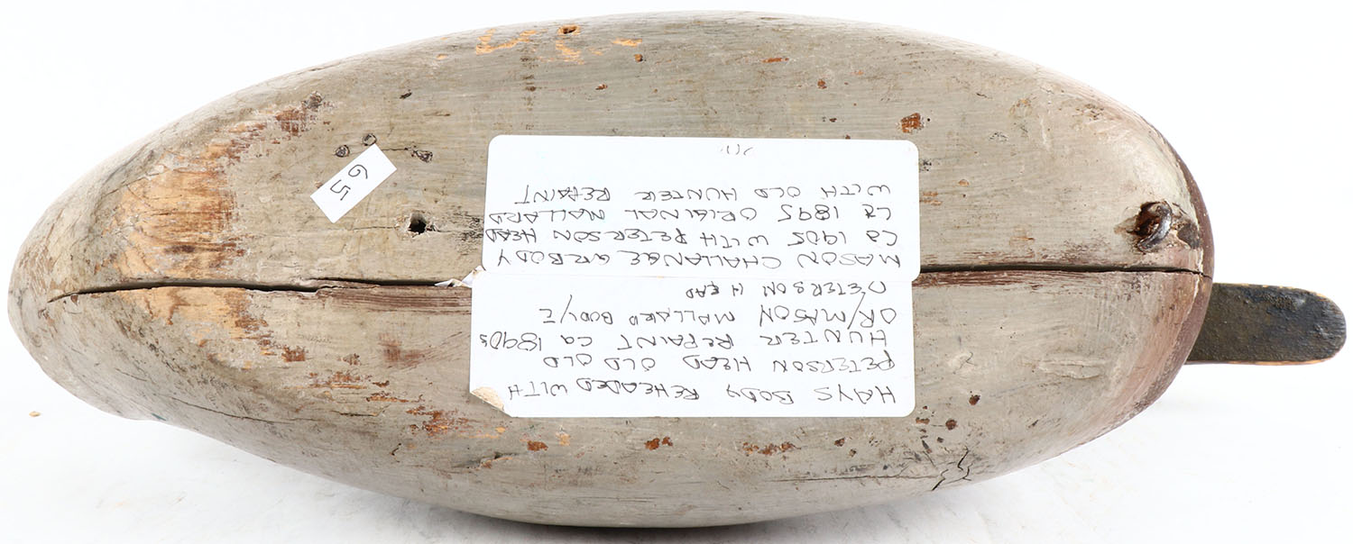 Mallard Drake by unknown maker, glass eyes, solid wood, has age cracks on back and bottom, head is loose, repainted. Grade: Very Good ++ - Value: 20 to 80