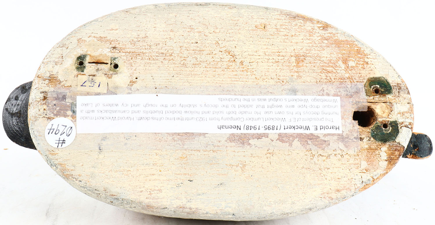 Bluebill Drake by Harold E. Wieckert, glass eyes, solid wood, bill is chipped on top, signed on bottom, original paint. Grade: Very Good ++ - Value: 30 to 200