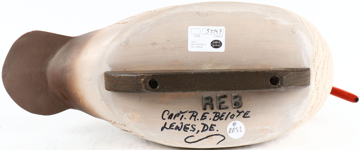 Hooded Merganser by Capt. R.E. Belotem Lewes, DE, painted eyes, structurally excellent, hollow wood, signed and branded on bottom, original paint. Grade: MINT - Value: 30 to 300