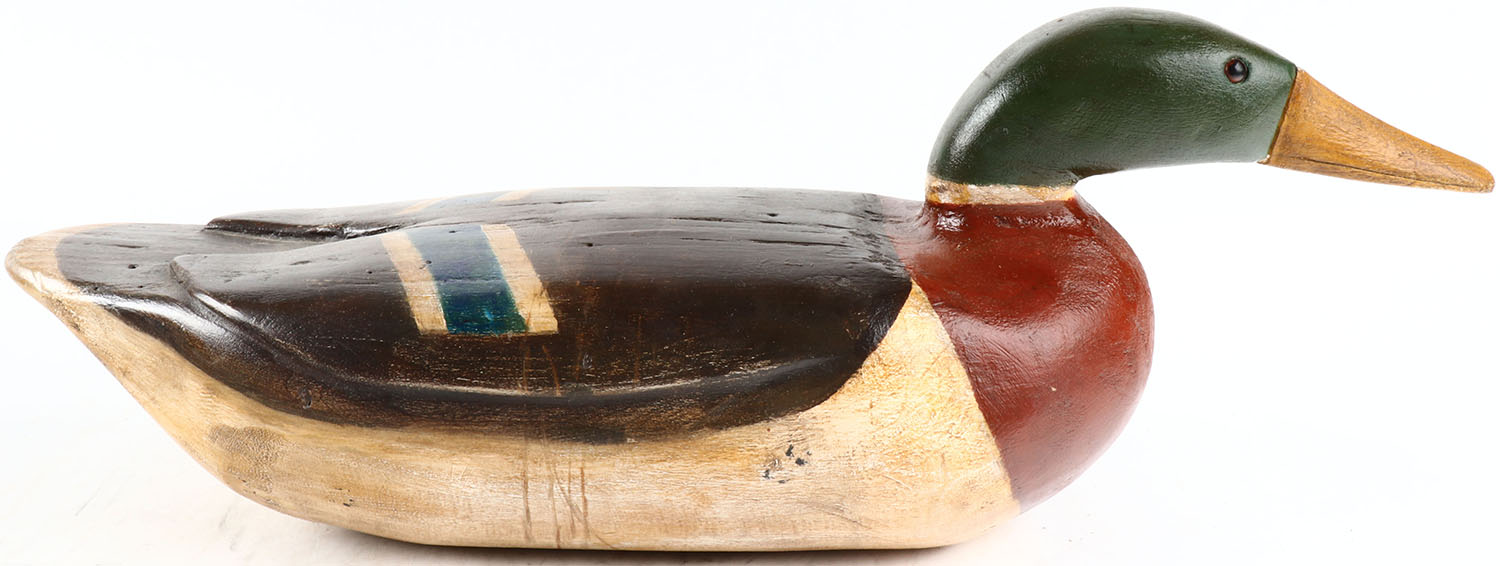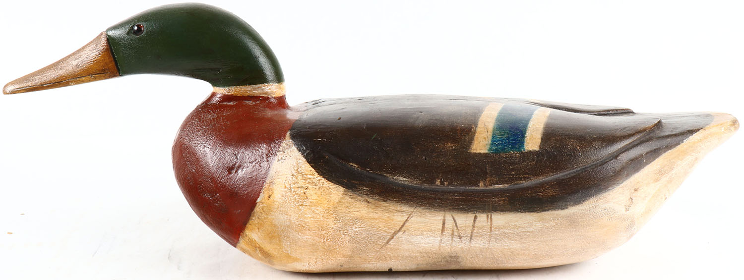 Mallard Drake by Jeff Mccall, glass eyes, structurally excellent, solid wood, branded RW on bottom original paint. Grade: Excellent + - Value: 30 to 200