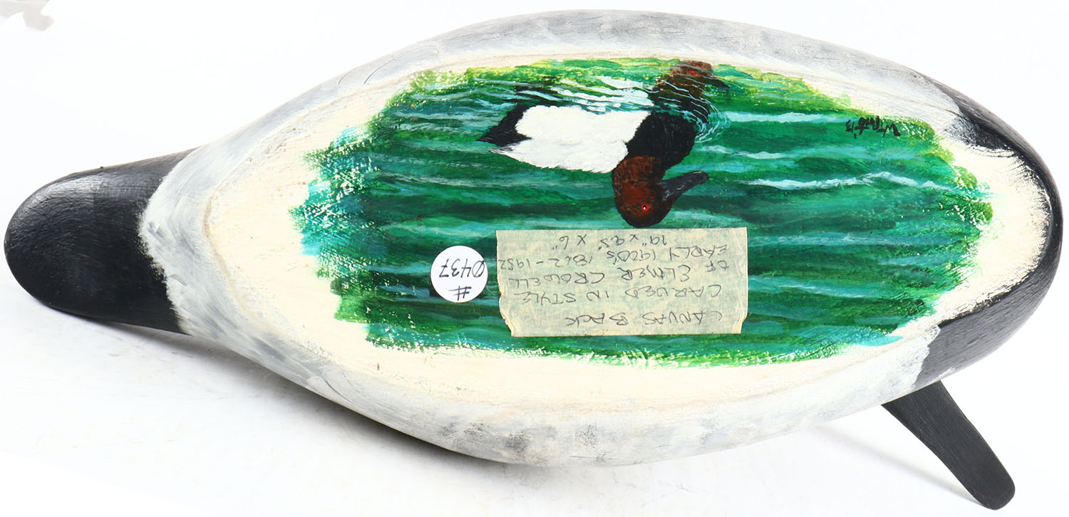 Redhead Drake in the style of Elmer Crowell, glass eyes, structurally excellent, solid wood, signed on bottom, original paint, has artist proof painting on bottom. Grade: MINT - Value: 30 to 300